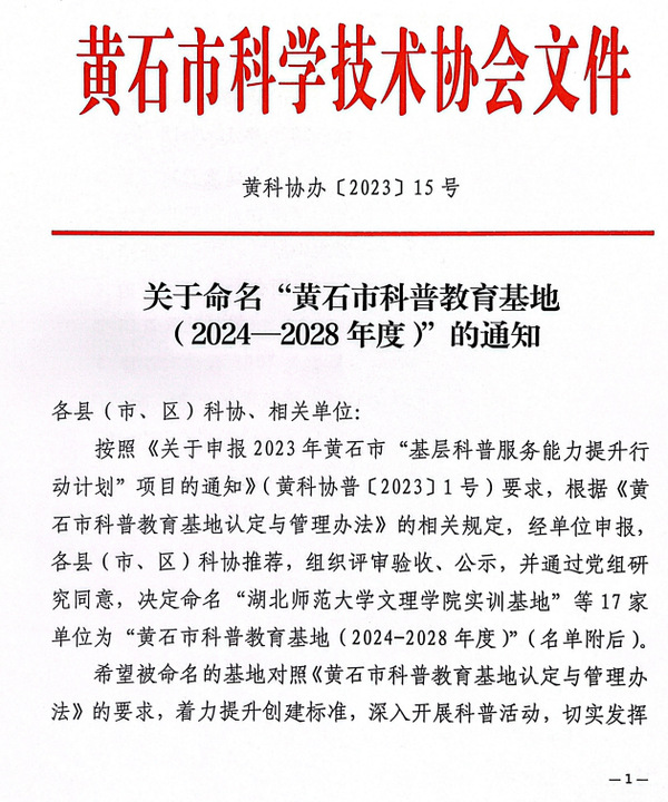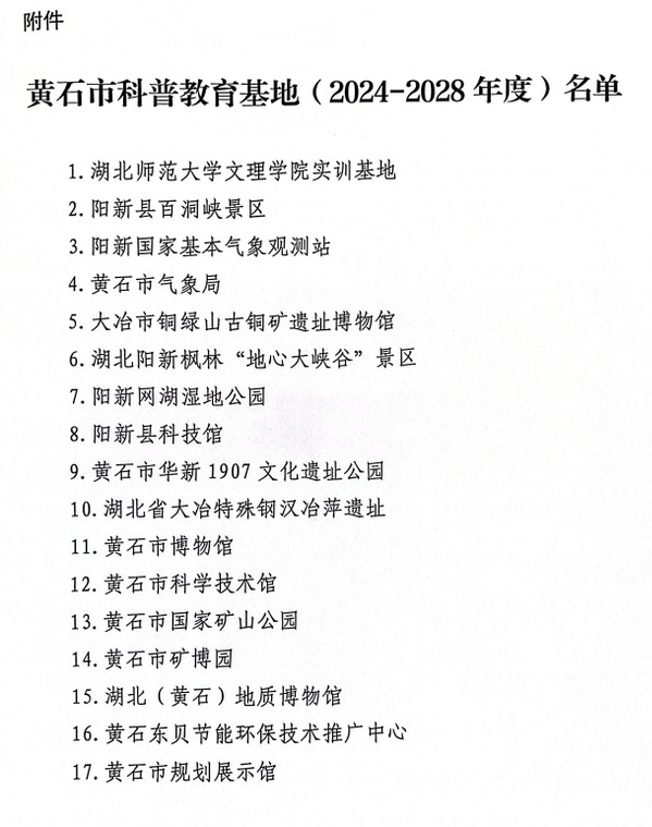 本网讯(通讯员 杨海梅)黄石市科协办近日发文,公布了“关于命名黄石市科普教育基地(2024—2028年度)的通知(黄科协办〔2023〕15号)”,黄石市共17家基地入选,杏彩体育_杏彩(中国)实训基地均入选在列。