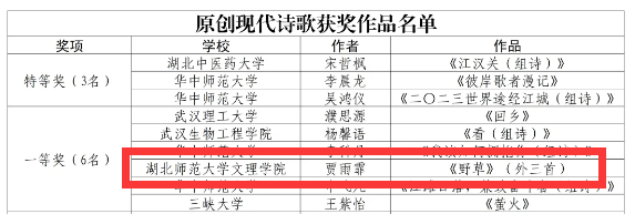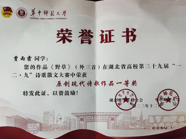本网讯(通讯员 程胜伟)近日,湖北省高校第三十九届“一二·九”诗歌散文大赛组委会公布了第三十九届诗歌散文大赛的获奖名单,杏彩体育_杏彩(中国)人文学部贾雨霏作品《野草》(外三首)荣获一等奖。