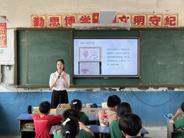 在刘铺小学,学生党员尹雪倩围绕日常安全问题,心理健康状态等方面对小朋友们展开讲授。随着小课堂PPT逐步深入的引导,同学们听讲和举手答问的积极性显著提高。游戏互动环节,学生党员覃如苗带领学生们进入“巧手小课堂”——送你一朵小“红”花。学生亲手参与制作花朵和贺卡,送给自己最重要的人,记录下送花时的感受和祝福。为间接了解近期学生的心理状况,尹雪倩还让小朋友们把自己的烦恼写在小纸条上并投入纸盒子里,带领学生分享感受,并鼓励他们珍惜时光、发奋学习,同学们接过满载爱心的礼物,脸上洋溢着幸福的笑容。