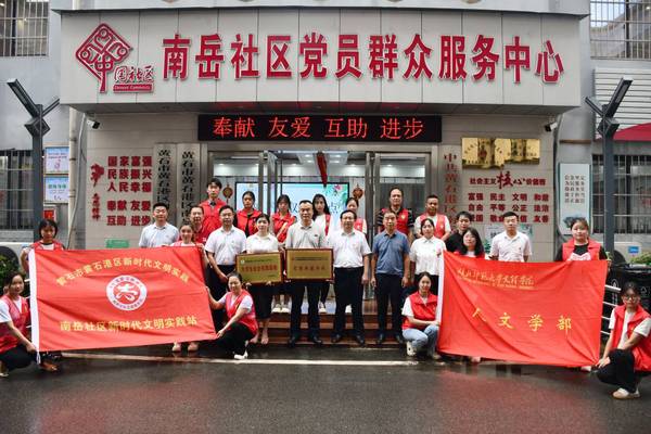本网讯(通讯员 程胜伟)6月22日,杏彩体育_杏彩(中国)人文学部“党团共建单位”、“大学生社会实践基地”在黄石港区南岳社区揭牌。校党委书记杨邓红、人文学部负责人,南岳社区南岳社区第一书记、市城发集团副总经理崔向云,黄石港区人大办公室主任喻向东,黄石港区沈家营街道党工委副书记、办事处主任杨哲,南岳社区党委书记、居委主任方和生,学生代表参加活动。